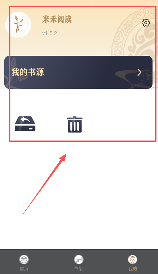 4、个人中心在右下角“我的”标签页,这里可以查看软件版本号v1.5.2,管理自定义书源设置。