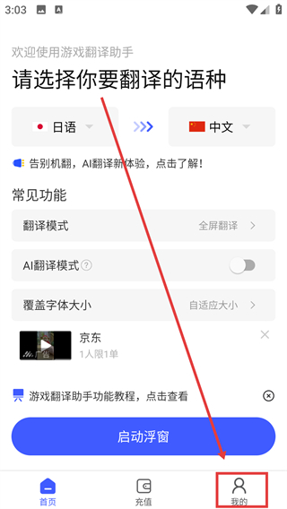 1、在首页选好翻译语后点底部的【我的】选项,能进入个人中心页,后续可调整翻译相关设置啦。