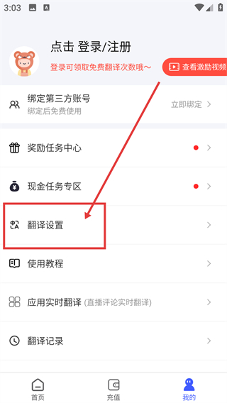 2、进入个人中心页后点【翻译设置】选项,能进入设置页面,这里有各类翻译配置项可调整哦。