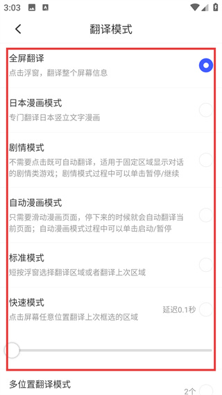 4、进入翻译模式页后,可选【全屏翻译】【剧情模式】等选项,挑适合当前场景的翻译模式哦。