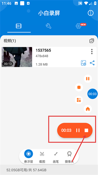 3、录制过程中,可通过悬浮控制栏查看时长,点击结束按钮,就能停止录制并保存当前的视频内容啦。