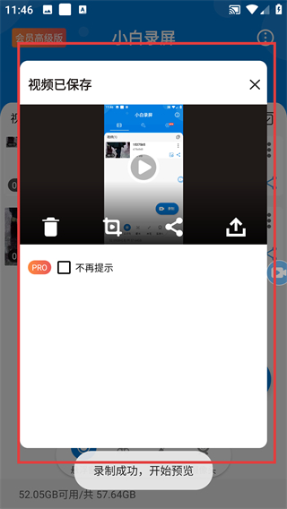 4、录制完成后会弹出【视频已保存】的提示,可在此预览视频,还能进行分享、删除等后续操作呀。