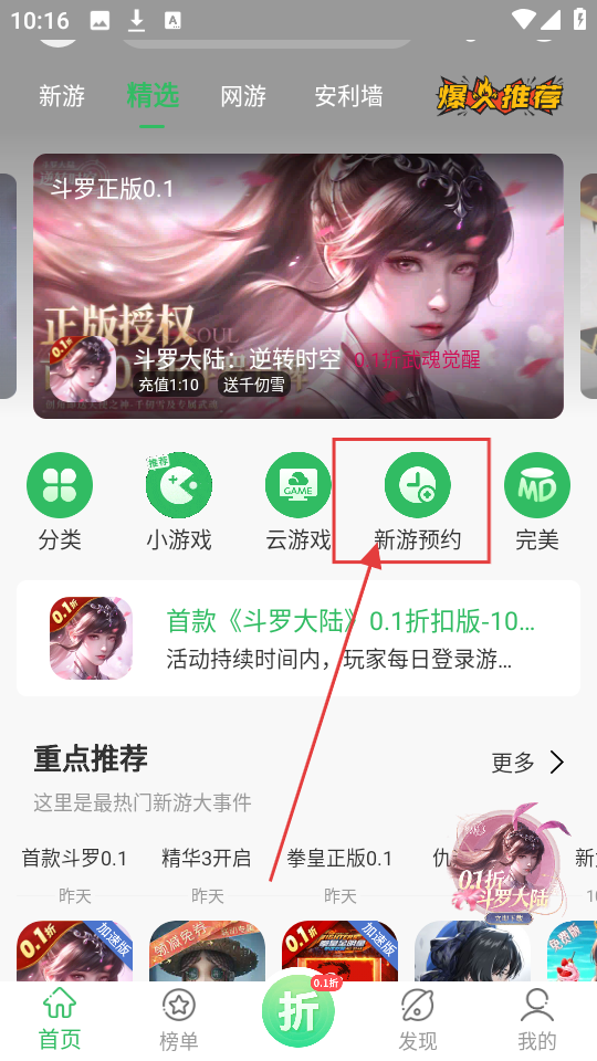 1、在软件首页,点击【新游预约】,可进入新游预约页面,查看可预约的新游戏啦。
