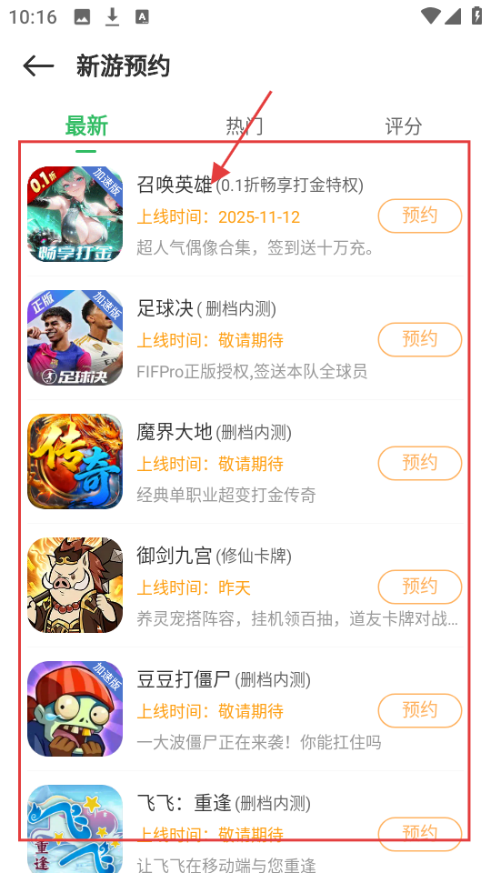 2、进入新游预约页面后,可看到多款新游戏,如【召唤英雄(0.1折畅享打金特权)】等,选择感兴趣的游戏哦。