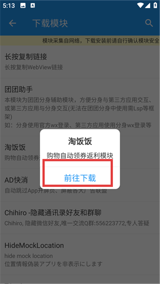4、选中【淘饭饭】模块后,点击弹出的【前往下载】按钮,就能开始获取这个购物相关的模块啦。