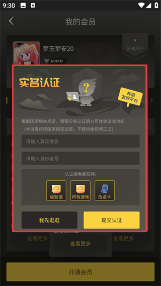 4、触发【实名认证】弹窗后,填真实姓名和身份证号再提交,就能解锁游戏功能还能领奖励哦。