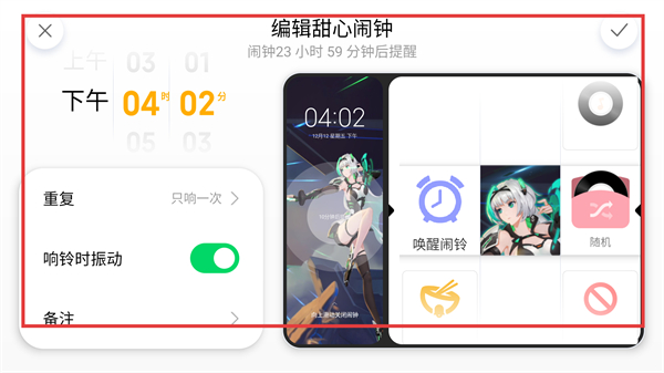 4、在编辑甜心闹钟界面可设置时间、重复规则等参数,配置完成后保存,就能启用专属的甜心闹钟提醒啦。