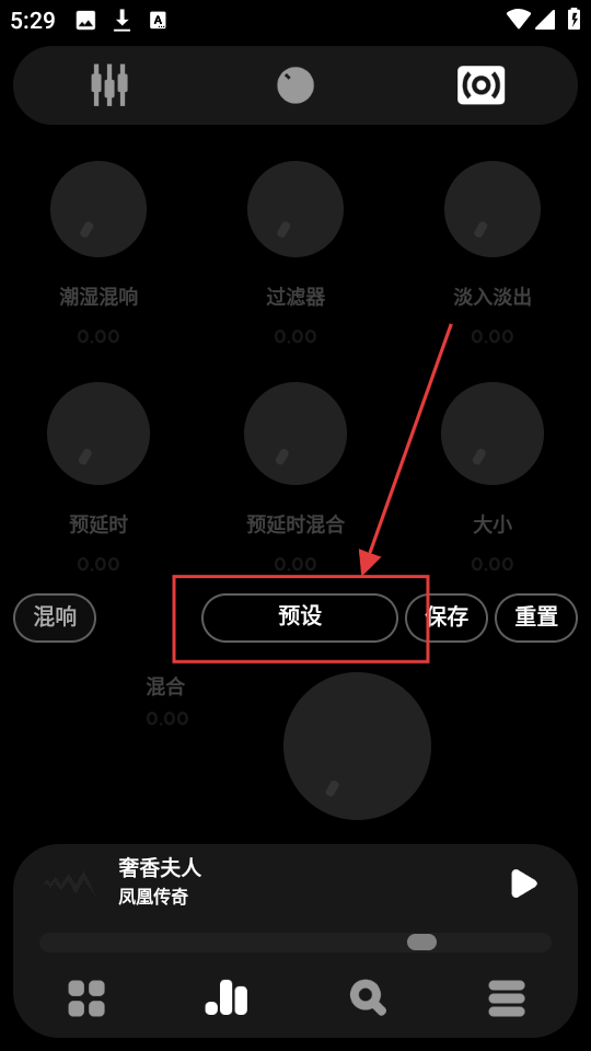 1、在音效设置界面,若想快速设置音效,点击【预设】按钮,就能看到各种预设的音效场景啦。