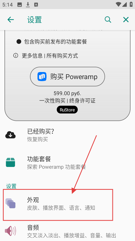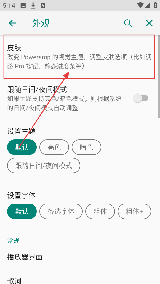 4、进入外观设置页面,点击【皮肤】选项,可改变Poweramp的视觉主题,还能调整皮肤相关选项呢。