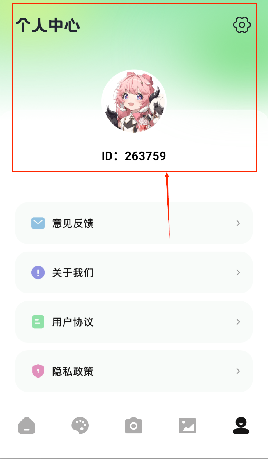 2、在个人中心页面可以查看自己的ID号和管理账户设置,点击右上角齿轮图标进入设置选项。