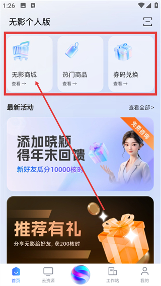 1、在首页点【无影商城】选项,就能进入商城页面,查看各类商品和兑换券码的入口啦。