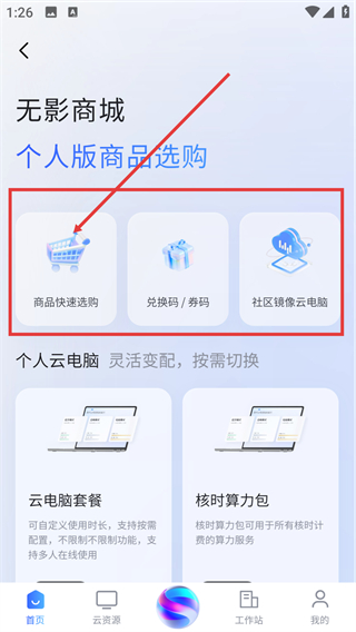 2、进入无影商城后,点【商品快速选购】,就能看到云电脑套餐等商品,按需挑选合适的配置哦。
