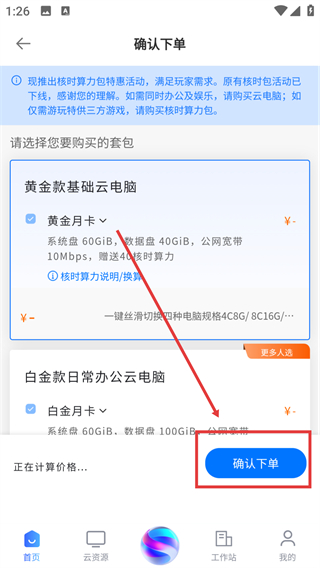 3、选好要购买的云电脑套餐后,点【确认下单】按钮,就能进入支付环节完成购买啦。