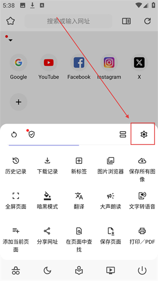 1、在浏览器首页,点击底部的菜单按钮,展开功能选项列表,可找到设置等管理入口啦。