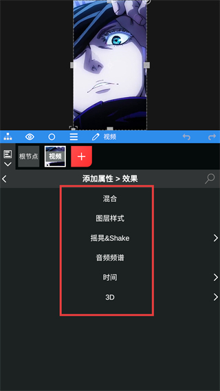 3、进入效果界面后,能看到【混合】【摇晃;Shake】等特效选项,选对应的就能给素材加效果啦。