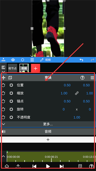 4、导入视频素材后,可在变换面板调整【位置】【缩放】等参数,还能设置音频等内容,编辑视频效果啦。