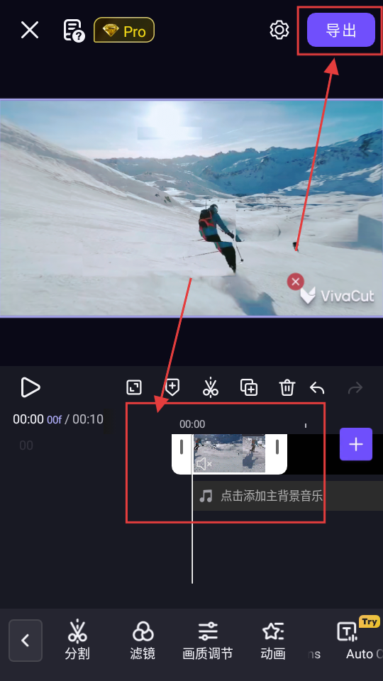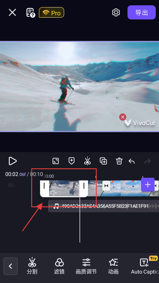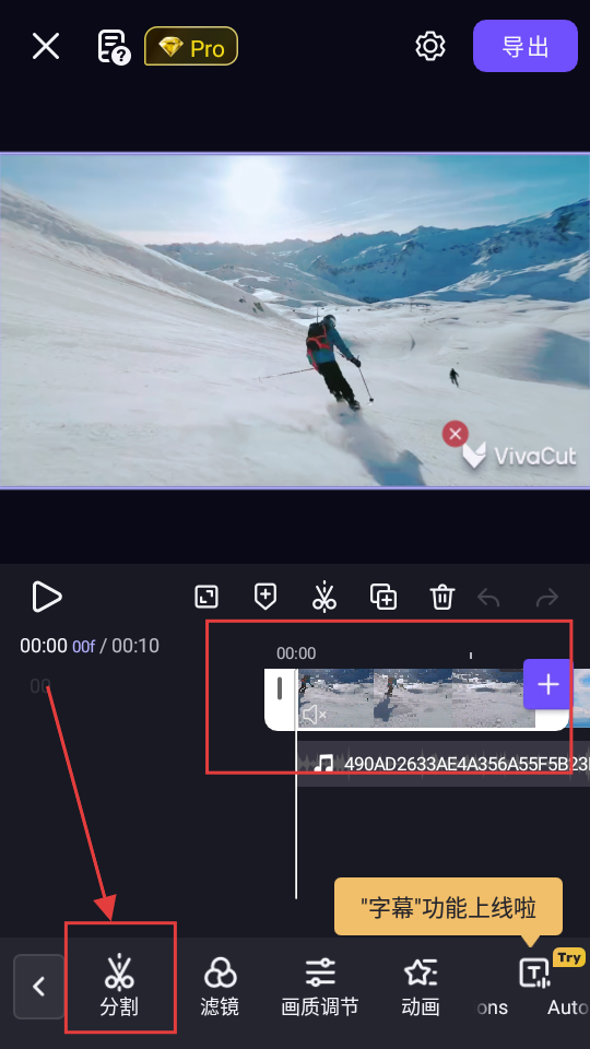 1、在VivaCut编辑界面,找到底部【分割】按钮,点击它可对视频进行分割操作,方便截取片段哦。