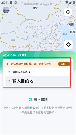 1、在主界面先处理定位权限提示,接着点击【请输入上车点】,就能进入起点选择页面,开始规划行程啦。