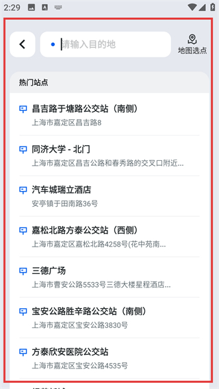 3、在目的地输入页,可从【热门站点】里选目标地点,也能手动输入,选好后就能进入行程确认页啦。