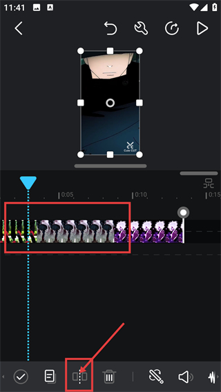 2、选中素材后点底部的分割按钮,能把素材分成两段,方便单独调整其中一段的内容哦。