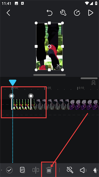 3、分割素材后,选中要移除的片段,点底部删除按钮,就能把这段素材从轨道里移除啦。