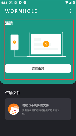 1、【WORMHOLE】主界面点击【连接虫洞】按钮,可建立手机与电脑的连接,实现文件拖拽传输功能。