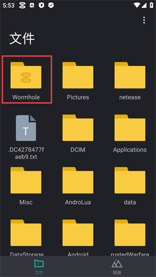 2、【文件】页面找到红框标注的【Wormhole】文件夹,旁有【Pictures】【netease】等文件夹可查看。