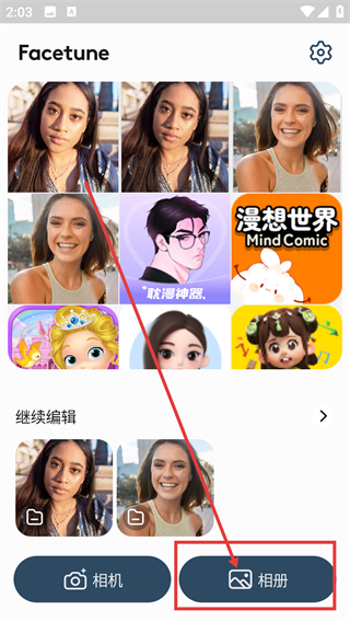 1、在【Facetune】首页点击底部的【相册】按钮,就能打开手机相册,选择想要编辑的图片进入处理页面啦。