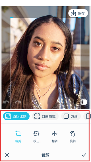 3、在裁剪界面可选择【原始比例】【自由格式】等模式,还能使用校正、翻转等工具调整图片角度哦。