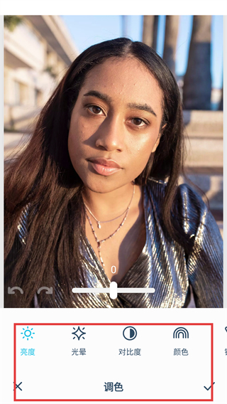 3、切换到【调色】功能页,可调整【亮度】【光晕】等参数,拖动滑块就能实时预览调色后的效果啦。