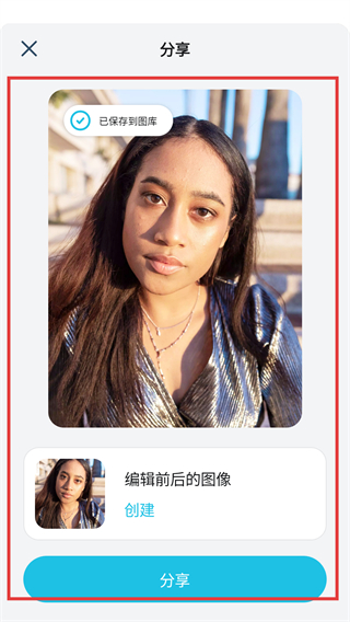 4、编辑完成后进入分享页,能看到已保存到图库的提示,点击【分享】按钮就能把编辑好的图片发出去啦。