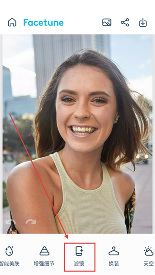 1、在【Facetune】编辑页点下方的【滤镜】按钮,能进入滤镜选择界面,后续可给照片加滤镜效果啦。