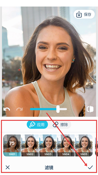 2、进入滤镜页选喜欢的滤镜样式,调好强度后点右下角的对勾,就能应用这个滤镜效果哦。