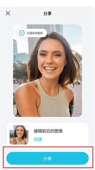 4、保存完成后进入分享页,点下方的【分享】按钮,就能把编辑好的照片分享给他人啦。