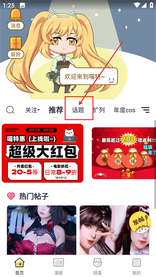 1、在【喵特】首页点击顶部的【话题】选项,就能切换到话题页面,查看各类兴趣相关的话题内容啦。