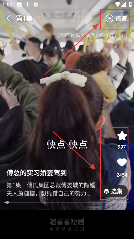 2、进入短剧播放页面,可点击【倍速】调整播放速度,还能点赞、收藏、选集哦。