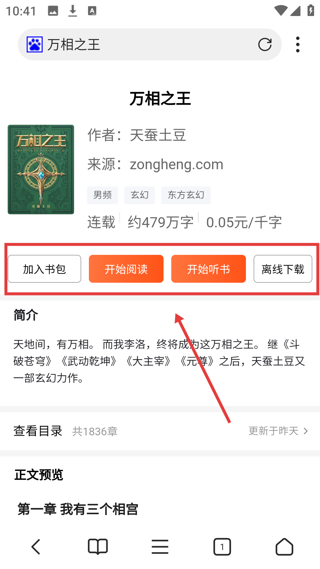 4、找到《万相之王》后,可选择开始阅读、听书等操作,开启小说之旅啦。