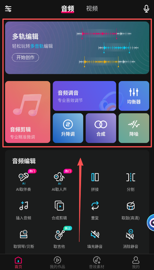 2、进入首页后点击“开始创作”使用多轨编辑功能,这里提供了丰富的音频处理工具,比如均衡器、升降调、降噪和合成等。