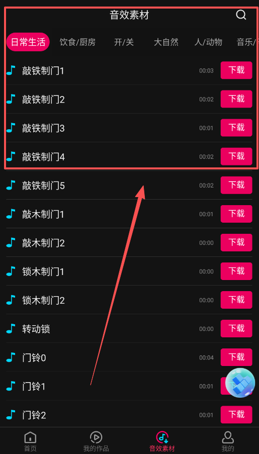 4、需要音效素材时进入“音效素材”板块,按日常生活、大自然等分类查找,点击每个音效旁的下载按钮即可获取。