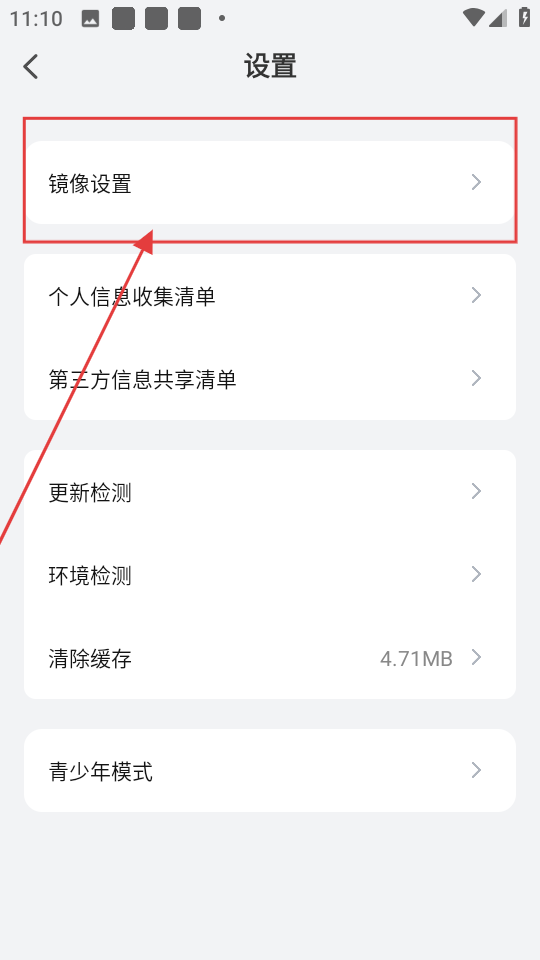 3、在设置页面,点击【镜像设置】,可进入镜像设置页面啦。