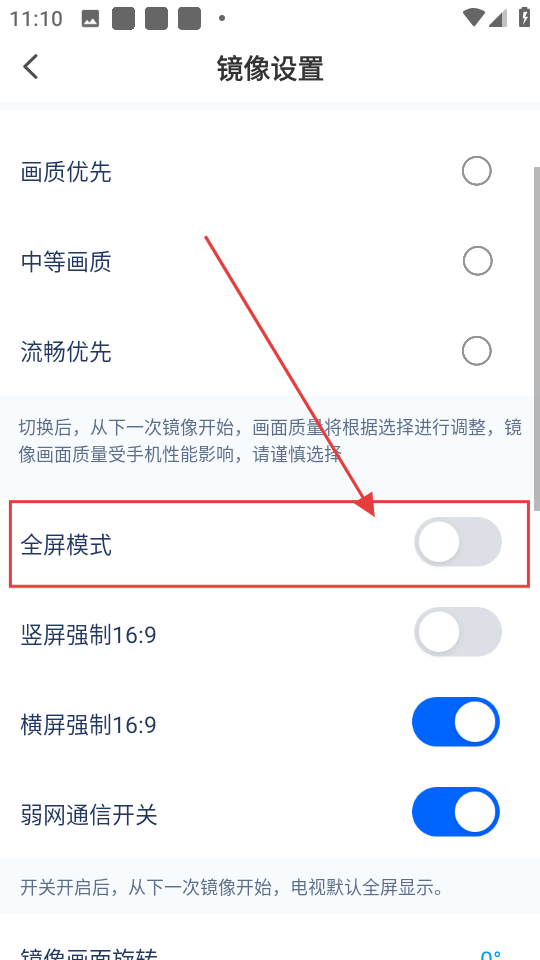 4、在镜像设置页面,可找到【全屏模式】开关,点击可开启或关闭全屏模式哦。