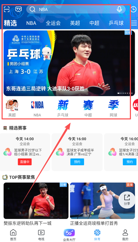4、在体育专区,精选NBA,全运会,英超等赛事信息,比如点击乒乓球赛事查看男团小组赛详情,不错过任何精彩瞬间。