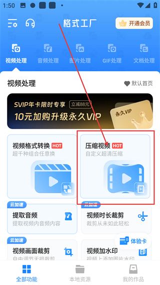 1、在格式工厂APP的全部功能页,点击【压缩视频】选项,进入视频选择界面,可挑选需要压缩的视频文件啦。