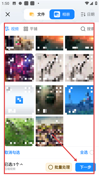 2、进入视频选择界面后,选中目标视频文件,点击【下一步】按钮,即可进入压缩参数的设置页面哦。