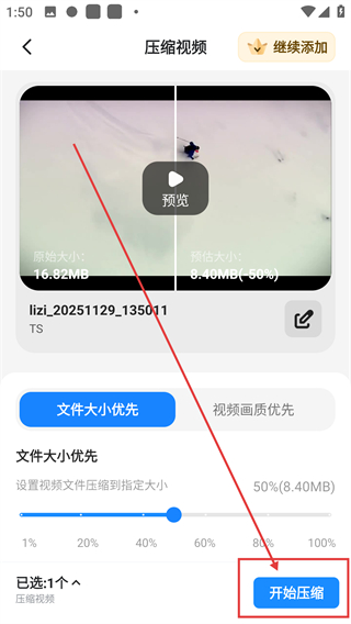 3、在压缩视频页面,选择【文件大小优先】等模式并调整压缩比例后,点击【开始压缩】按钮,触发导出方式选择弹窗呀。