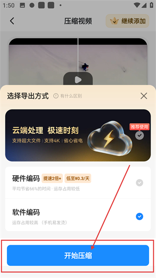 4、在导出方式弹窗中,选定合适的处理方式后,再次点击【开始压缩】,即可启动视频的压缩处理流程啦。