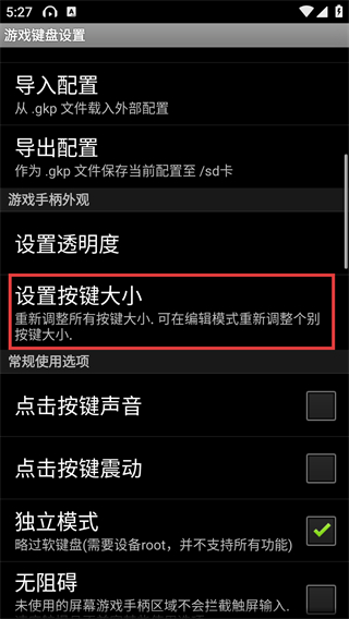 2、游戏键盘设置页面点击红框标注的【设置按键大小】选项。