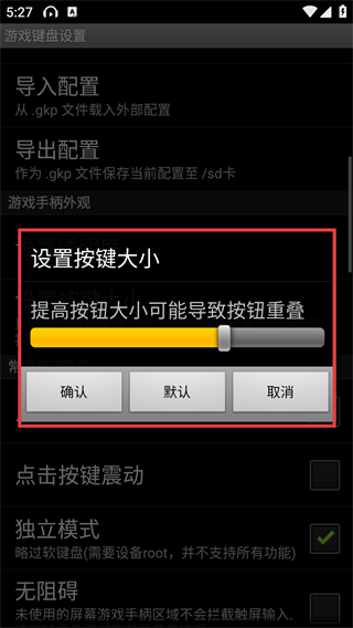 3、弹出的【设置按键大小】弹窗中,红框区域显示“提高按钮大小可能导致按钮重叠”提示语,搭配滑块可手动调整按键大小数值。