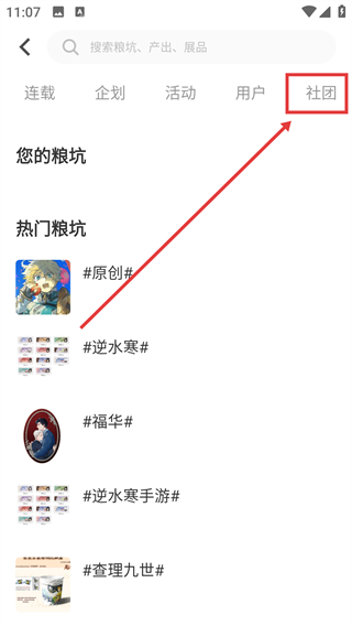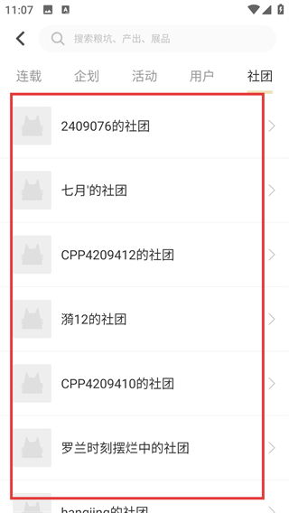 2、滑动分类栏后点击【社团】选项,就能切换到社团列表页面,查看各类用户创建的社团啦。