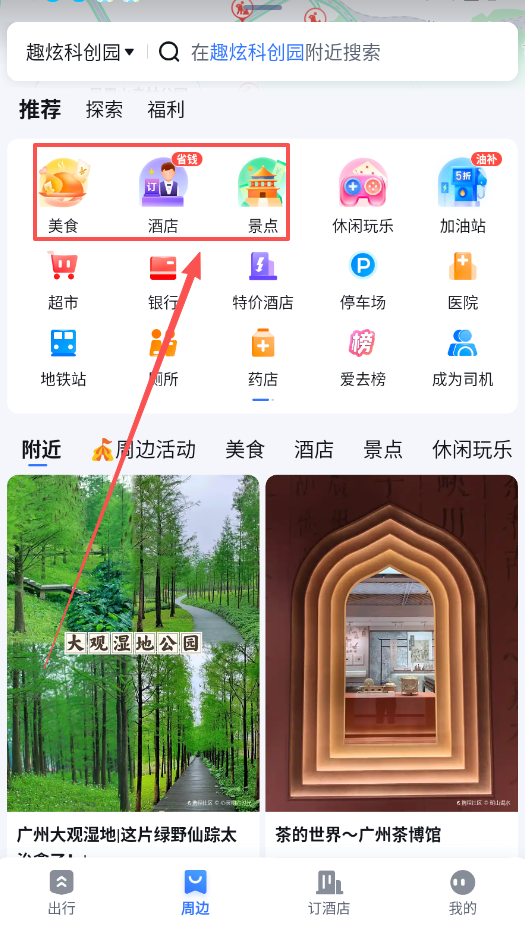 3、想看看身边有什么,就进入某个地点比如趣炫科创园的页面,下面有美食、酒店、景点好多分类可以选,点一下就能直接查路线了。
